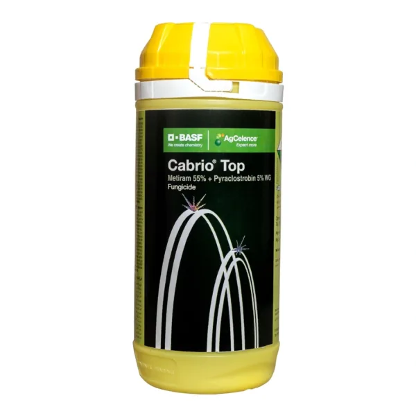 BASF Cabrio Top is a powerful broad-spectrum fungicide formulated with Metiram 55% and Pyraclostrobin 5% WG. It provides effective protection against a wide range of fungal diseases affecting various crops. Cabrio Top works by combining contact and systemic action, ensuring quick disease control and long-lasting protection. Its advanced plant health benefits enhance crop vigor, improve yield quality, and reduce stress in plants. The formulation allows fewer spray applications while maintaining extended disease control, making it an economical and reliable solution for farmers. Cabrio Top has a dual mode of action. Metiram acts as a contact fungicide inhibiting spore germination, while Pyraclostrobin provides systemic and translaminar action by inhibiting fungal respiration, resulting in effective and long-lasting disease control. Early blight, Late blight, Downy mildew, Anthracnose, Leaf spot diseases