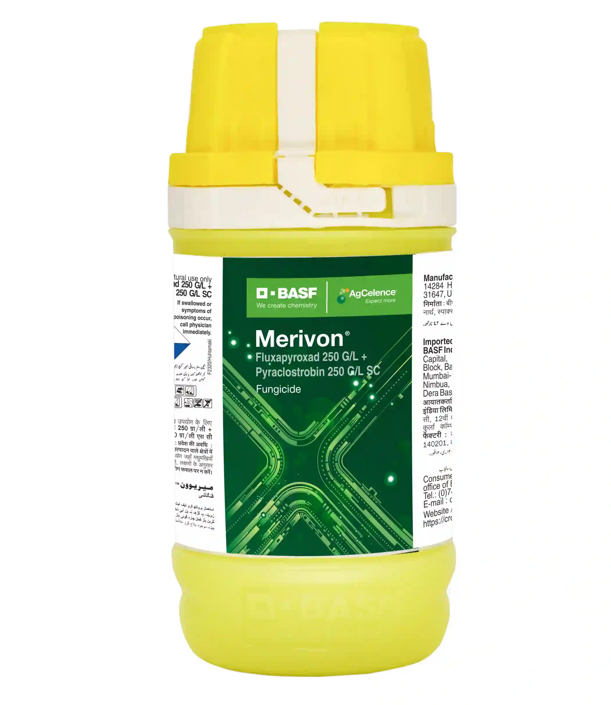 BASF Merivon SC Fungicide is a premium broad-spectrum fungicide developed for effective control of major fungal diseases in crops. It contains a powerful combination of Fluxapyroxad and Pyraclostrobin, delivering both preventive and curative action. The formulation works systemically and translaminarly, ensuring deep penetration and long-lasting protection. Merivon improves plant vigor, enhances stress tolerance, and supports higher yield and better crop quality. Its advanced chemistry makes it a reliable solution for professional farmers seeking consistent disease management and prolonged crop protection. Merivon has a dual mode of action. Fluxapyroxad inhibits fungal respiration by blocking succinate dehydrogenase (SDHI), while Pyraclostrobin inhibits electron transfer in mitochondrial respiration. This combination provides preventive, curative, and long-lasting systemic action. Powdery mildew, Leaf spots, Blights, Anthracnose, Rusts, Other fungal diseases Fruits and vegetables , Cereals and pulses , Oilseeds , Plantation and horticultural crops