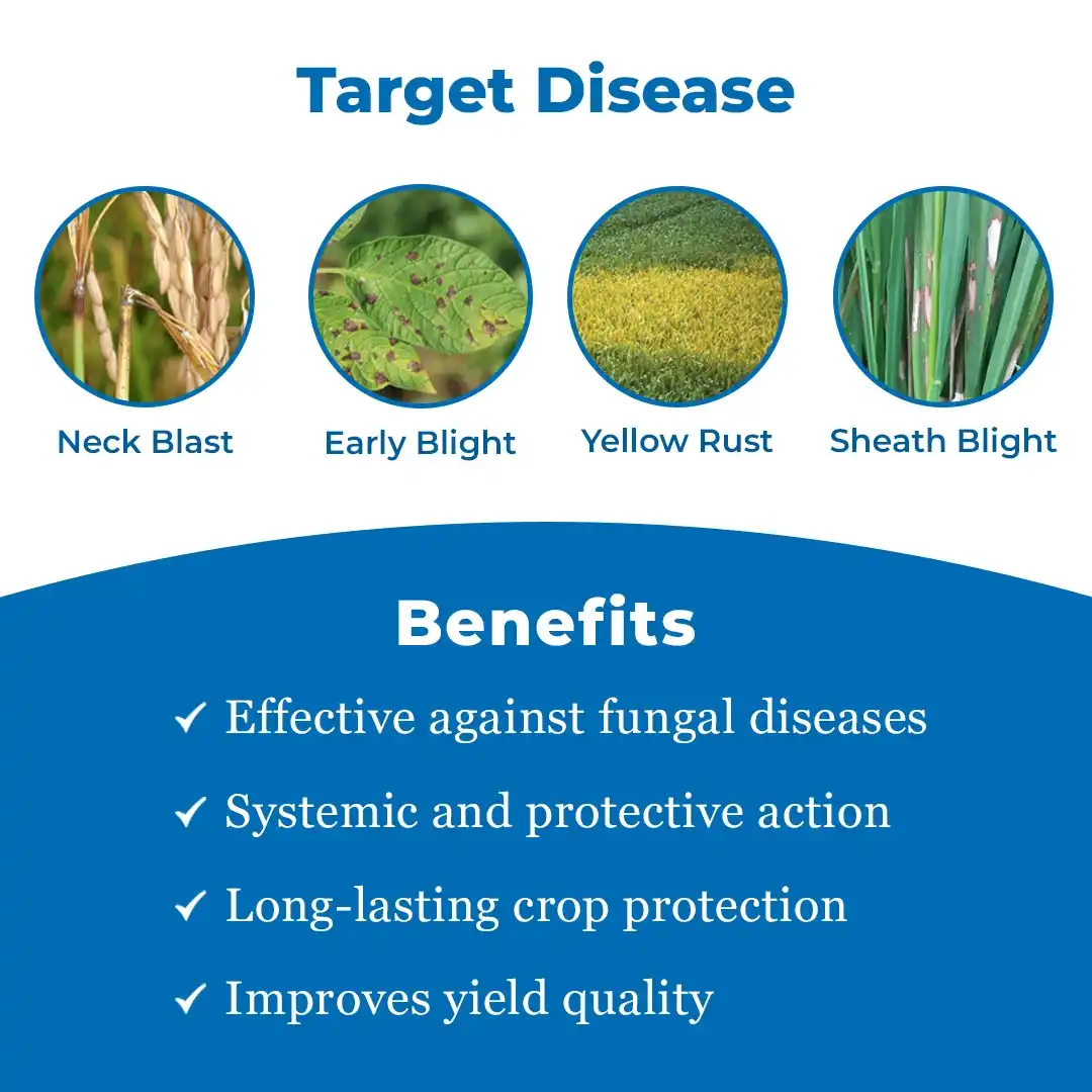 Bayer Nativo fungicide penetrates deeply into crops and spreads via translaminar activity. This activity cures the crops affected by fungal diseases such as powdery mildew, leaf spot, and yellow rust, and maintains overall health. Bayer Nativo fungicide also interferes with the reproduction process of the fungus and prevents disease occurrence with systemic and contact action. In crops like grapes and chilli, Nativo fungicide provides extended protection and strengthens plants, leading to higher-quality crops. This fungicide can be used for both protective and curative applications, minimizing the spread of infection. Broad-Spectrum Protection : Bayer Nativo fungicide controls crop diseases, including Sheath blight, Powdery mildew, and Anthracnose. Dual Mode Action : Bayer Nativo fungicide features dual action, systemic and contact action, ensuring complete crop safety. Improves Yield : This fungicide helps prevent disease, resulting in healthier, higher-quality harvests. Rainfast Solution : Bayer Nativo fungicide is effective on crops even after rainfall, making it cost-effective for farmers. For Foliar sprayer Application : Use 0.5 to 1 gm per liter of water. Bayer Nativo is suitable for crops such as rice, Grapes, Chilli, Wheat, Tomato, Mango, Cotton, Banana, Apple, Cabbage, Maize, Black Gram, Tea, and Groundnut. Nativo fungicide controls fungal diseases like Sheath blight, Leaf blast, Neck blast, Glume discoloration, Powdery mildew, Anthracnose, Alternaria leaf spot, Yellow rust, Early blight, Blister blight, and Tikka leaf spot. Bayer Nativo fungicide is intended for agricultural use only. Nativo Fungicide is used to control a wide range of fungal diseases in crops like paddy, wheat, fruits, and vegetables. It provides both preventive and curative protection, helping improve crop health and yield. Nativo Fungicide should be applied at the early stage of disease infection or as a preventive spray. Timely application ensures better disease control and long-lasting protection for crops.