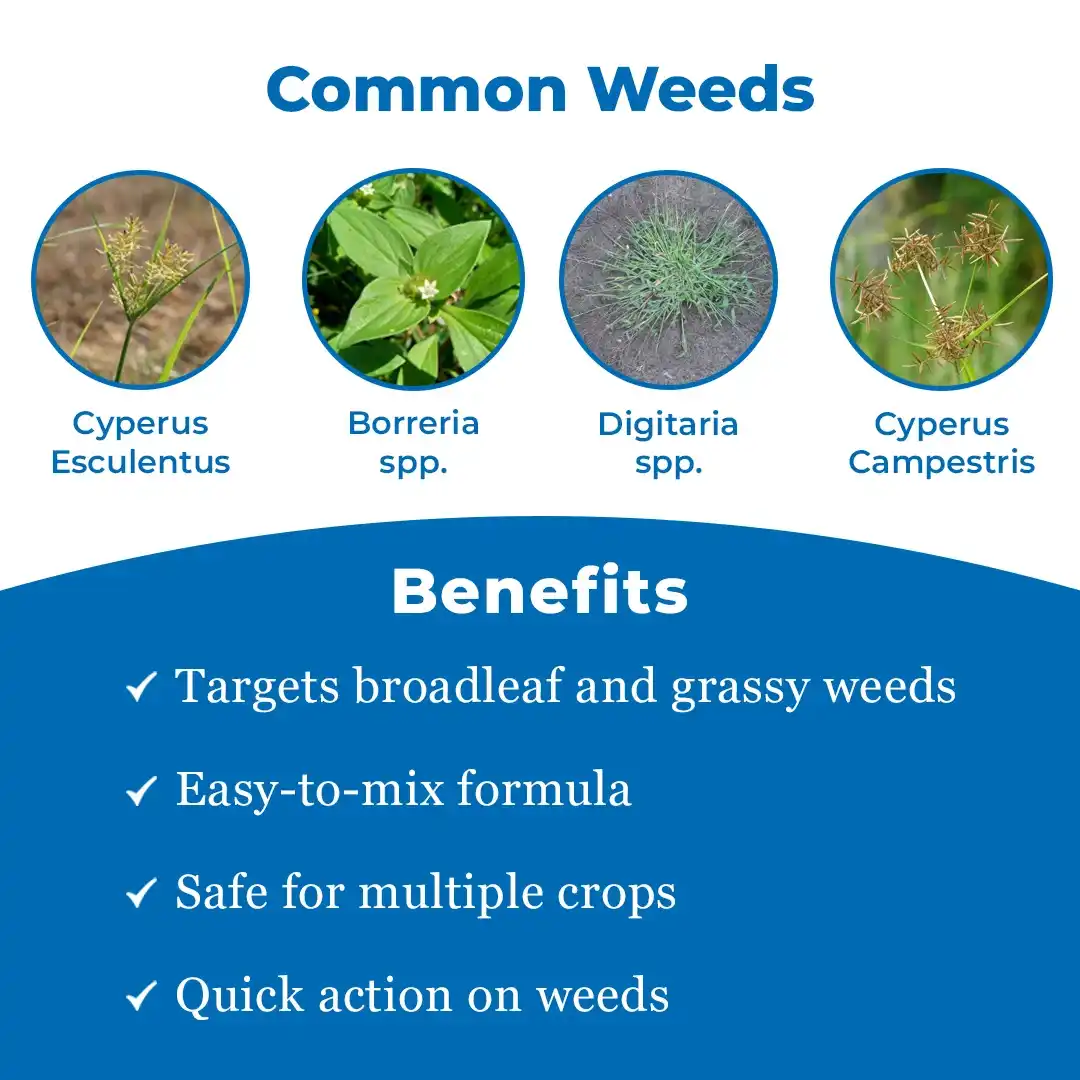 Bayer Sencor is a selective herbicide that is used for eliminating broad-leaf weeds and unwanted grasses. Sencor herbicide translocates to the roots of the weeds and interferes with the photosynthesis process, leading to their death. Bayer Sencor herbicide is safe for the crops like soybean, potatoes, and tomatoes, and only attacks harmful weeds with selective activity. Effective weed control helps crops in absorbing nutrients and essential resources efficiently, ensuring better quality growth. Broad-spectrum Control : Bayer Sencor herbicide controls a wide range of annual and perennial weeds. Dual Action : This herbicide controls weeds through systemic and contact action, providing thorough protection. Usage Flexibility : It is both pre-emergent and post-emergent, allowing flexible application to the farmers. Selective Activity : Bayer Sencor herbicide does not target crops and only attacks target weeds with selective action. Sencor herbicide is suitable for Sugarcane, Potato, Tomato, Wheat, and Soybean crops. Bayer Sencor herbicide is effective for weeds like Digitaria spp., Cyperus campestris, Borreria spp., Chenopodium album, Cyperus spp., and others. Do not consume any food or drink while applying the herbicide.