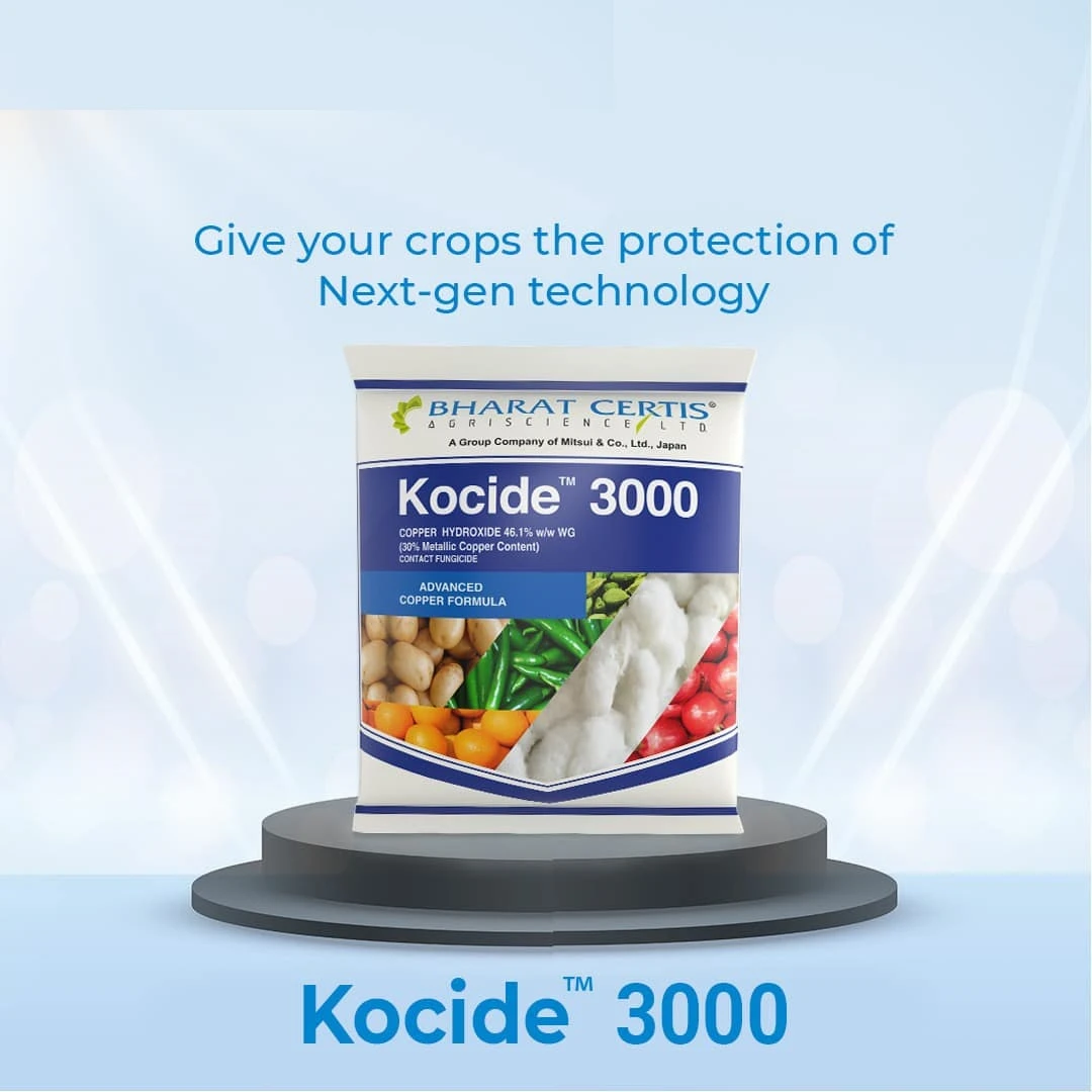 Bharat Certis Kocide 3000 is made up of advanced Copper technology, which is used to control diseases using small particles. Kocide 3000 fungicide releases a high concentration of copper ions and provides complete coverage to the crops, making it impossible for the fungi to develop. This fungicide also ensures rainfastness protection to crops like cotton and chilli through contact action. It is designed using Bioactive technology, making it safe for the crops and the environment. Highly Effective : Bharat Certis Kocide 3000 fungicide kills bacterial as well as fungal diseases on the crops, allowing crops to thrive. Rainfastness : The effect of the Kocide 3000 fungicide does not go away even during rainy weather conditions. Healthy Crops : This fungicide provides complete disease management and prevents damage to the crops, ensuring healthy growth. Uniform Coverage : It translocates deeply into the crops and spreads through all the parts, providing long-lasting protection. Kocide 3000 is suitable for crops such as cotton, pomegranate, citrus, chilli, cardamom, and potato. Bharat Certis Kocide 3000 fungicide is effective against diseases such as Bacterial Blight, Anthracnose, Twig Blight, Capsule Rot, Dieback, and Late Blight. Bharat Certis Kocide 3000 fungicide is for agricultural purposes only.