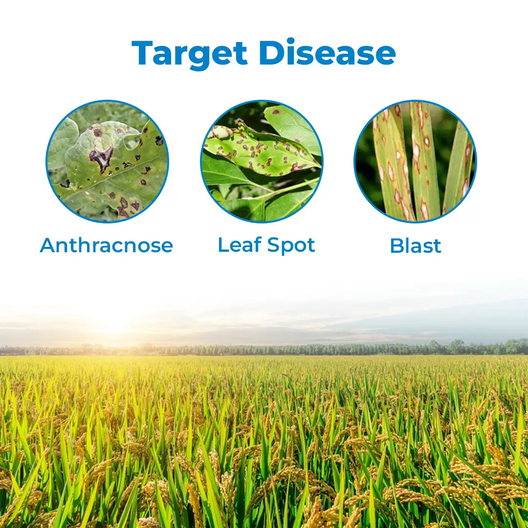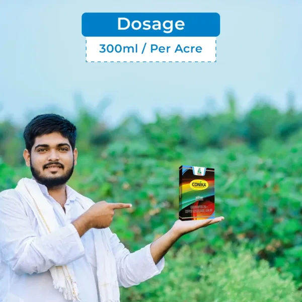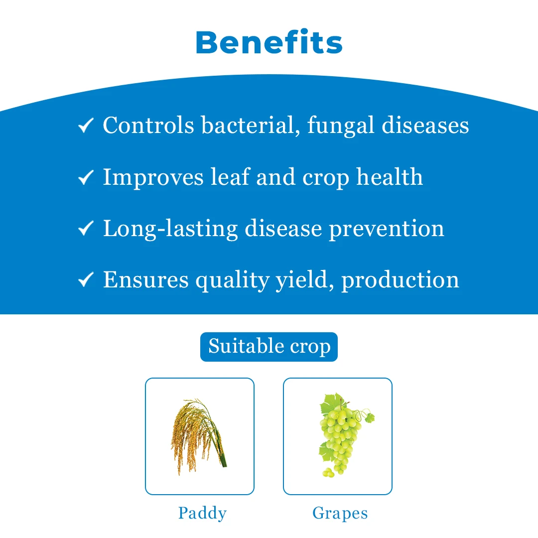 Dhanuka Conika is a powerful fungal remedy that contains Kasugamycin 5% + Copper Oxychloride 45% WP, which works by blocking protein synthesis through systemic action and forming a protective layer on crops to prevent further infection. The Conika fungicide also acts as a bactericide, making it an effective 2-in-1 remedy. This fungicide also offers versatile application timing, making it convenient and easy to use. 2-in-1 Remedy: Dhanuka Conika combines fungicidal and bactericidal action, offering a 2-in-1 remedy at cost-effective prices. Quick Action: Upon application, Kasugamycin 5% + Copper Oxychloride 45% WP offers immediate protection for healthier crops. Long Lasting: Conika fungicide offers prolonged effectiveness, reducing the need for frequent applications. Convenient Application: Kasugamycin 5% + Copper Oxychloride 45% WP offers flexible application timing, making it convenient to use. Dhanuka Conika Fungicide is suitable for crops such as grapes, rice, and pomegranate. Dhanuka Conika Fungicide is effective against diseases such as Anthracnose, Bacterial leaf spot, Leaf and Neck Blast, Bacterial Blight, and Fruit Rot. Do not go over the recommended dosage limits, as it may harm the crops. Wear Personal Protective Equipment (PPE) like masks, gloves, etc., while using the product. Store the product as instructed and away from kids, animals, water sources, and food items. Dhanuka Conika fungicide (Kasugamycin 5% + Copper Oxychloride 45% WP) is for agricultural purposes only.