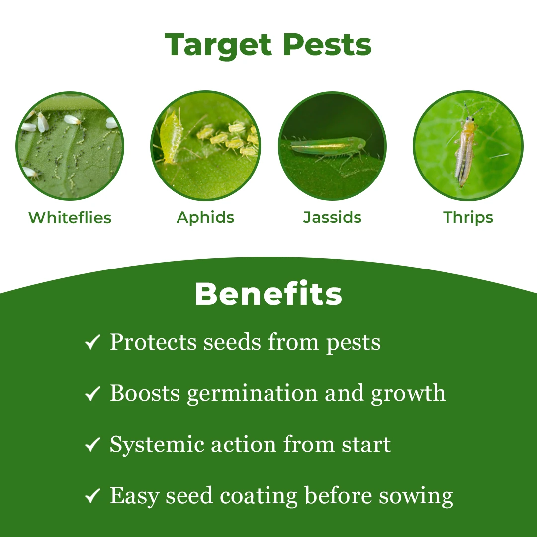 Coromandel Optra FS is an effective liquid-based insecticide that is used as a seed treatment to control sucking and chewing pests such as aphids, jassids, and thrips. Optra FS insecticide controls soil-borne insects by targeting their central nervous system and eliminating them effectively through systemic action. It prevents damage and loss caused by pests. The Optra insecticide provides long-lasting protection, ensuring healthy growth and better yields. Broad-Spectrum: Optra FS insecticide can tackle a wide range of insects such as jassids, thrips, aphids, and more. Long-Lasting: This insecticide provides systemic action, ensuring prolonged effectiveness and reducing the need for continuous application. Preventive Use: This insecticide is used as a seed treatment to protect at an early growth stage. Better Yield: Optra insecticide helps keep the crop pest-free, leading to healthier growth and higher yields. Optra insecticide is suitable for crops like Cotton, Chilli, Maize, Okra, Soybean, Wheat, Shorghum, Rice, and Sunflower. Optra insecticide targets pests like Thrips, Aphids, Jassids, Stem and Shoot flies, Termites, and more. Read the instructions carefully before mixing and applying the Optra insecticide. Use safety gear, such as gloves and masks, to avoid direct skin contact. Store the Optra insecticide away from kids, animals, water sources, and food items.
