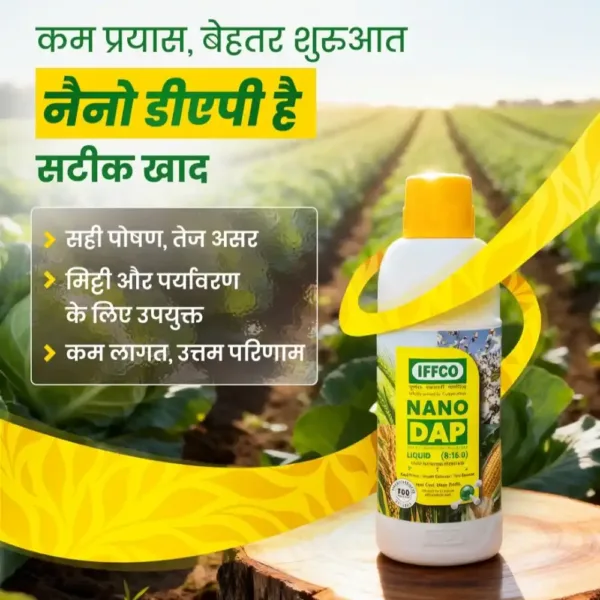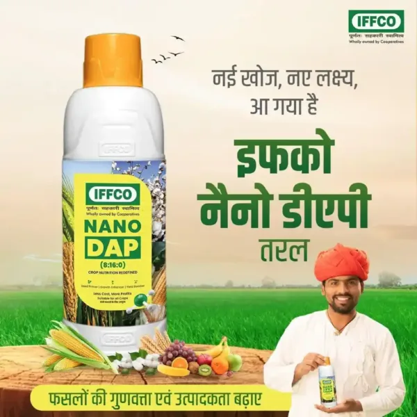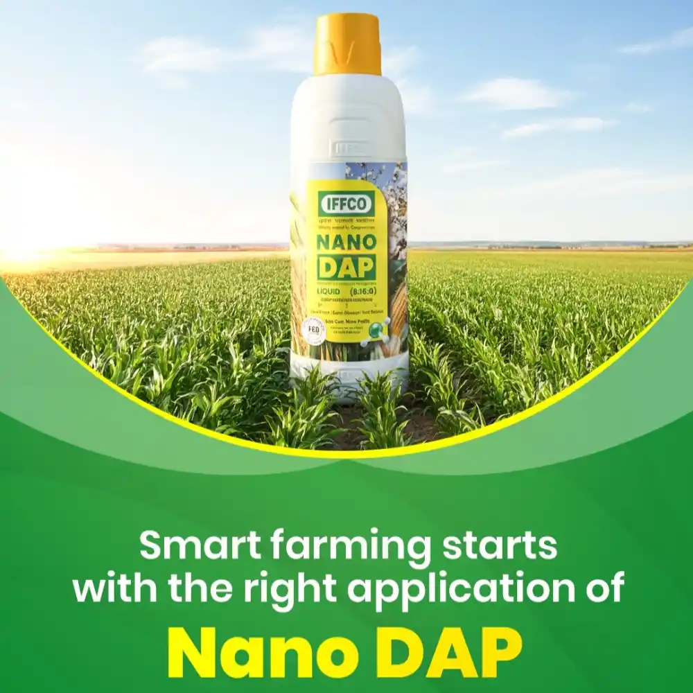 IFFCO Nano DAP (Liquid) is a highly efficient nutrient source formulated to supply available nitrogen and phosphorus to a wide range of crops. Its nano-sized particles, less than 100 nanometres, allow faster entry through seed surfaces and plant openings, ensuring improved absorption and nutrient utilization. The bio-polymer functionalised nano clusters enhance spreadability, boost chlorophyll levels, improve photosynthesis and increase seed vigour. This advanced formulation supports sustainable farming, reduces excessive fertilizer use, improves crop quality and contributes to higher yields with minimal environmental impact. IFFCO Nano DAP is an effective and innovative liquid fertilizer designed to correct nitrogen and phosphorus deficiencies in standing crops. It contains 8 percent nitrogen and 16 percent phosphorus (P2O5) in a nano form, ensuring increased efficiency and faster assimilation. Precision application of Nano DAP helps reduce the use of conventional DAP by 50 to 75 percent while supporting strong vegetative growth, improved quality and better productivity across major crops. Nano-Di-Ammonium Phosphate (Liquid) 8 % Nitrogen And 16 % Phosphorus (8% N: 16 % P) Provides efficient nitrogen and phosphorus nutrition to all crops Ensures more than 90 percent nutrient use efficiency under field conditions Acts as an excellent seed primer for early germination and vigour Reduces soil, air and water pollution from excessive fertilizer use Bio-safe, eco-friendly and suitable for residue-free agriculture Foliar Spray: 2-4 ml per litre of water during good foliage and flowering stages Drones: 250-500 ml per tank of 10-20 litres for 1 acre coverage