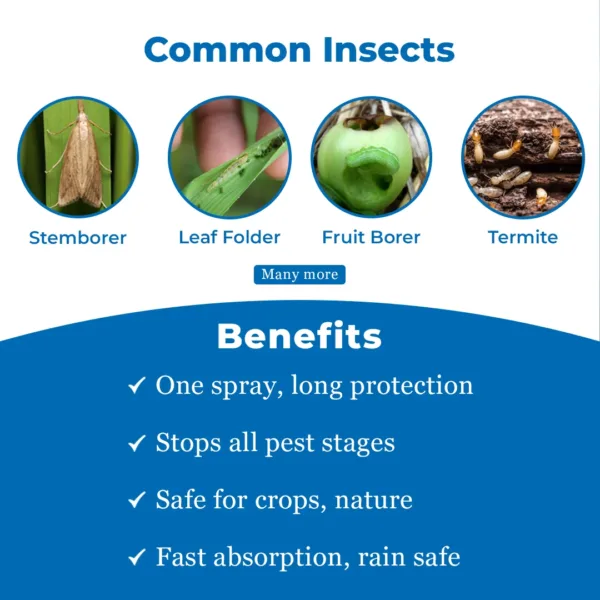 JU Decigen is a powerful insecticide containing Chlorantraniliprole 18.5% SC, which has a unique muscle-paralysis action through Systemic, Contact, and Stomach action. It provides strong control over a wide range of lepidopteran and other pests like stem borers, bollworms, caterpillars, termites, and pod borers. Ju Decigen insecticide has a powerful formula that stops pest feeding within minutes of application. It is safe for crops and non-target organisms and helps provide improved yields. Broad-Spectrum: Chlorantraniliprole 18.5% SC is effective against a wide range of pests, including Early shoot borer, Top borer, and many more. Effective Working: The Ju Decigen controls various stages of pest growth, from immature to mature stages, providing effective control. Long-Lasting: Chlorantraniliprole 18.5% SC provides strong residual activity, ensuring prolonged effectiveness. Targeted Action: Ju Decigen insecticide is effective against target pests while not harming beneficial insects for safe use. Rainfast Formula: After application, Chlorantraniliprole 18.5% SC is absorbed quickly and cannot be washed away easily by the rain. Mode of Application: Preventive application with Curative properties. Ju Decigen insecticide is suitable for crops like Rice, Cabbage, Cotton, Sugarcane, Tomato, Chilli, Brinjal, Pigeon pea, and other crops. Ju Decigen insecticide is effective against Stem borer, Leaf folder, Diamondback moth, American bollworm, Spotted bollworm, Tobacco caterpillar, Termite, and others. Avoid direct skin contact and inhalation by wearing safety gear like masks, gloves, etc Store the product as instructed and keep it away from water sources, food items, kids, and animals.