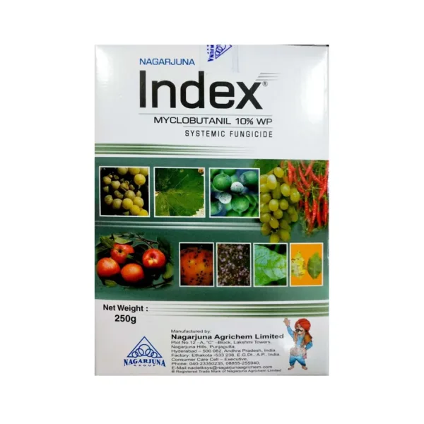 Nagarjuna Index is a broad-spectrum systemic fungicide that provides long-lasting protection for crops against fungal diseases such as powdery mildew and scab. Nagarjuna Index fungicide inhibits the formation of fungal cell membranes and protects crops like grapes and chilli from severe damage. The rainfastness formulation of this fungicide ensures crop safety during stressful weather conditions like rain, promoting healthy growth. Broad-Spectrum : Nagarjuna Index fungicide controls powdery mildew, scab, leaf spot, and a wide range of other diseases. Systemic Action : This fungicide provides internal protection to crops by spreading throughout the plant. Curative Application : Index fungicide provides curative action against crop diseases and promotes healthy growth. Rain-Fastness : The fungicide lasts for a longer period, even during rainy conditions, making it cost-effective for the farmers. Safe to Use : Index fungicide is safe for pollinators, predators, and parasites, which is beneficial for the crops. Nagarjuna Index fungicide is effective against leaf spot, powdery mildew, scab, and dieback. Wear a mask, goggles, and gloves to avoid contact with skin and eyes. Nagarjuna Index fungicide is for agricultural and gardening purposes only.