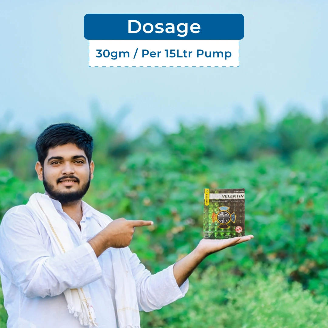 Velektin insecticide is a non-systemic solution containing Emamectin Benzoate 1.5% + Profenofos 35% WDG. It controls harmful pests and insects such as ballworms, fruit borer, and fall armyworm on crops like cotton, maize, and chilli through stomach and contact action. Velektin insecticide WDG, Water Dispersible Granule formulation provides uniform coverage to crops, offering effective control over pests within 24 hours. Emamectin Benzoate 1.5% + Profenofos 35% WDG is a versatile product. Wear Personal Protective Equipment to avoid contact with skin and eyes. Maintain hygiene and wash your hands after using Velektin insecticide. Store the Emamectin Benzoate 1.5% + Profenofos 35% WDG safely. Keep Velektin insecticide out of the reach of children, pets, food, and water sources.