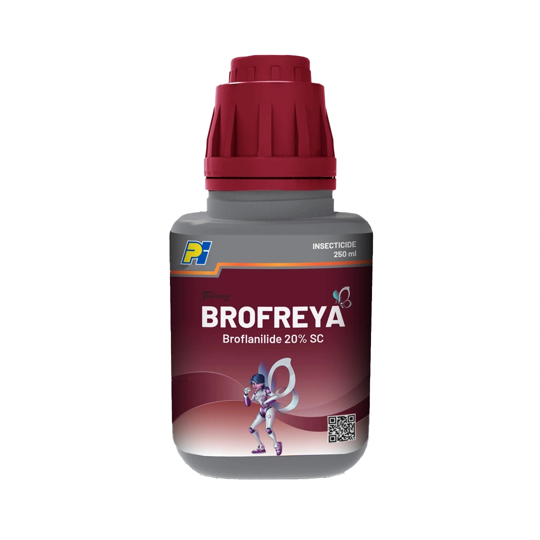 PI Brofreya is a powerful insecticide containing Broflanilide 20% SC as its active chemical component. It is very effective against various sucking and chewing pests. This insecticide is long-lasting, ensuring pest-free growth of crops and allowing them to grow healthy, yielding higher-quality crops for better profits. Long-Lasting: Broflanilide 20% SC provides a systemic mode of action, ensuring a prolonged protective effect. Versatile Use: PI Brofreya can be used on a wide range of crops for effective pest control. Broad-Spectrum: Broflanilide 20% SC can control a wide range of pests, including DBM, Thrips, and more. Quick-Action: PI Brofreya’s chemical composition offers quick pest knock-down upon application for rapid pest relief. Rainfast: Broflanilide 20% SC is absorbed quickly by the crops and is not washed away easily by the rain For Foliar Application: Use 50 ml of Broflanilide 20% SC per acre. PI Brofreya is suitable for Brinjal, Cabbage, Chilli, and Okra. Broflanilide 20% SC targets pests like Fruit and Shoot borer, Thrips, Jassids, DBM, and Tobacco caterpillars Store the product as instructed and away from kids and animals.