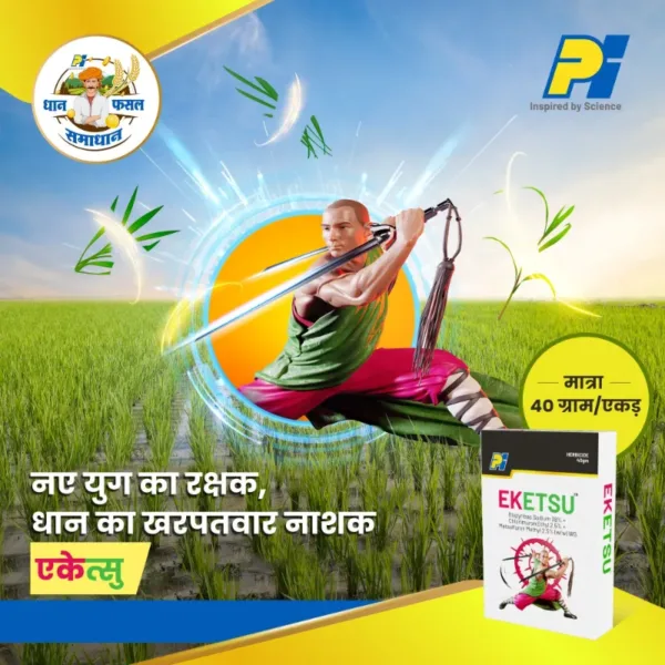 Pi Eketsu is a broad specturm systemic post emergent herbicide for selective control of key grasses, sedges, broad leaf weeds in rice crops. It offers unique combination of 3 different technologies for maximum weed control efficiency Bispyribac Sodium 38% + Chlorimuron Ethyl 2.5 % + Metsulfuron Methyl 2.5 %(w/w) WG ALS Inhibitors / Amino Acid Synthesis Inhibitor:-The novel mechanism of action attributed to ALS (acetolactate synthase) inhibitors. Enzymes are common to the biosynthesis of the branch-chain amino acids (valine, leucine, and isoleucine). This class of chemicals affects seedling growth. Older plants exhibit varied signs of malformation, stunting, and reduced seed production. Broad spectrum-Controls Grasses, Sedges and BLWs- Very effective on difficult to control weeds-Sedges & BLWs along with key grasses New technology with Improved efficacy – Enhances Productivity by protecting crop from crop-weed competition High solubility resulting in better absorption in target weeds Flexibility of application timing at 2-5 leaf stage of weeds Safe chemical Profile- Safe to rice crop-No shock to crop resulting in natural growth Direct Seeded Rice: 15-25 days after sowing at 2-5 leaf stage of weeds. Transplanted Rice: 10-15 days after transplanting at 2-5 leaf stage of weeds.