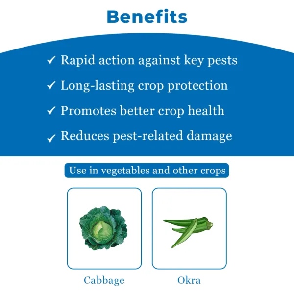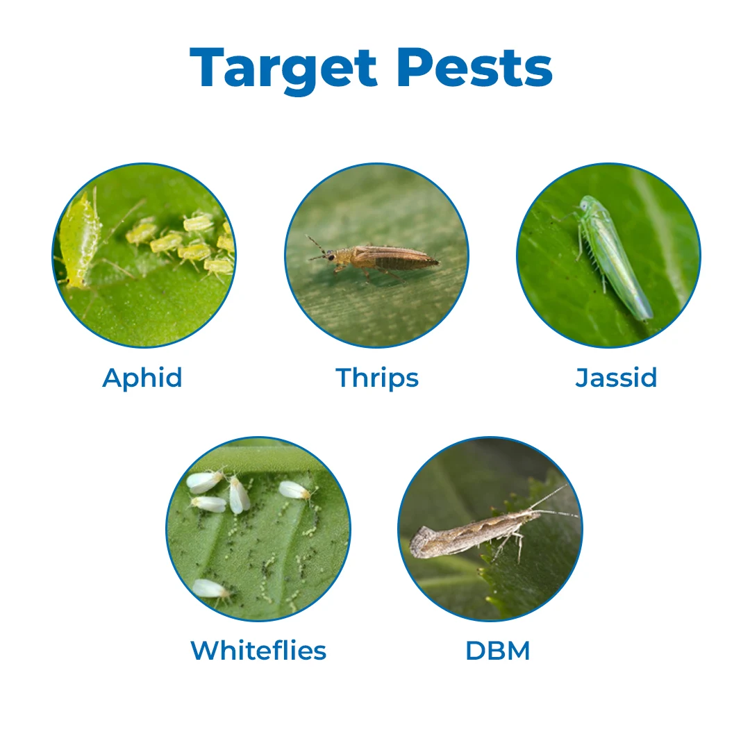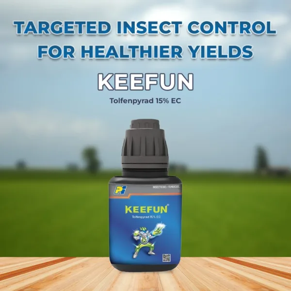 Keefun is a broad-spectrum insecticide that controls sucking and chewing pests such as aphids, jassids, and thrips on multiple crops. Keefun insecticide has an anti-feeding activity, which does not allow pests to feed and chew on the crops. This insecticide can be used for IRM (Integrated Resistance Management), making it highly effective against pests that have developed resistance against other remedies. It provides complete crop protection by disrupting the energy production of the pests and killing them immediately through contact action. Broad-Spectrum : Keefun insecticide is effective against a wide range of pests such as aphids, jassids, thrips, whiteflies, and diamondback moths. Dual Action : Keefun prevents pests and feeding on crops through contact and anti-feeding activity. Ultimate Protection : This insecticide’s anti-feeding activity protects crops from further damage and produces healthy crops. Controls Pest Lifecycle : This insecticide targets all life stages of pests, including eggs, young ones, and adults, offering continuous protection. Keefun insecticide is suitable for crops like okra, cabbage, mango, chilli, cumin, and onion. Keefun insecticide for whiteflies, hoppers, bugs, jassids, aphids, thrips, leaf miners, mites, and scale insects.