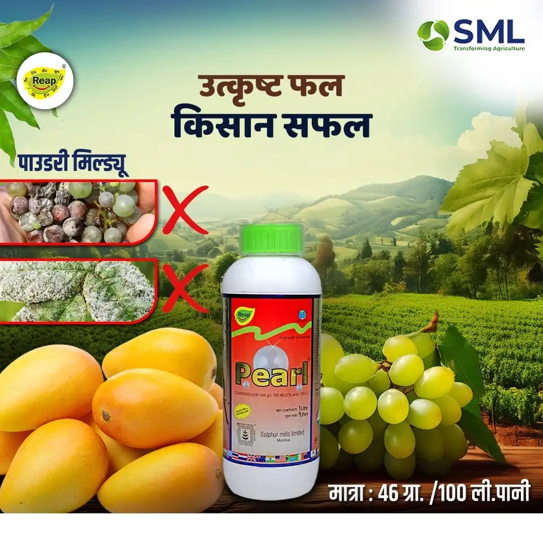 Sulphur Mills Pearl is a systemic fungicide containing Carbendazim 46.27% SC. This fungicide is effective against fungal diseases on crops such as mango and grapes through protective and curative action. This Pearl fungicide is used to control seed-borne diseases with the help of seed dressing, ensuring early germination and healthy growth of the crops. Dual-action Formula: Pearl fungicide controls existing diseases and also prevents new fungal infections through protective and curative action. Versatile: Carbendazim 46.27% SC is a widely used fungicide as it controls seed-borne diseases and fungal diseases such as powdery mildew. Rain-fastness: This fungicide ensures complete crop protection even in rainfall, reducing the need for re-application. Safe to Use: This fungicide is less toxic compared to other fungicides, making it eco-friendly. Protects Crop Quality: This Pearl fungicide does not leave any stains on the crops and promotes healthy growth, maintaining crop quality. Easy to Use: Carbendazim 46.27% SC Soluble Concentrate formulation is easy to use on the crops with the help of foliar spray. Pearl fungicide is suitable for crops such as grapes and mango. Pearl fungicide is effective against fungal diseases like powdery mildew. Wear Personal Protective Equipment (PPE) such as gloves, goggles, and a mask. Wash your hands properly after using the Sulphur Mills Pearl. Keep Carbendazim 46.27% SC out of reach of children and pets.