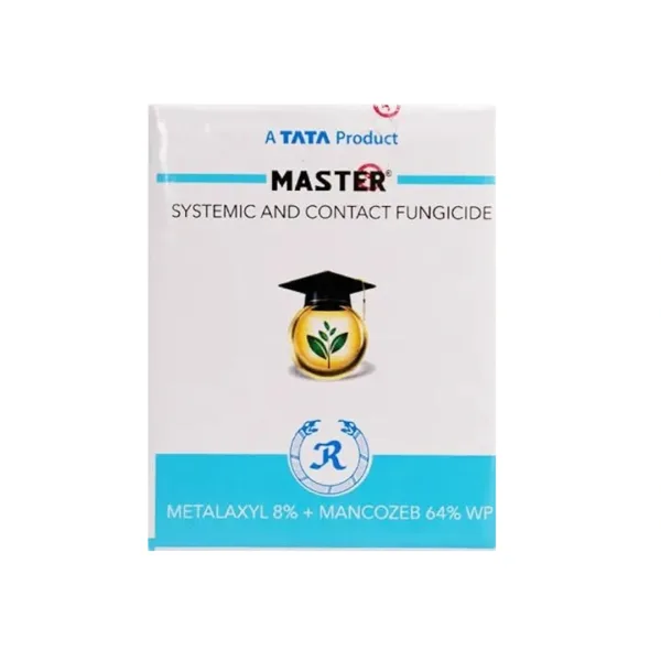 Tata Master is a broad-spectrum fungicide effective against a wide range of diseases on crops such as potatoes, mustard, and tobacco. Tata Master fungicide contains a unique combination of Mancozeb 64% + Metalaxyl 8% WP , which protects the crops for an extended period through systemic and contact protection. Quick Action Fungicide: Tata Master is quickly absorbed by the crops through translocation action and targets diseases immediately. Improves Crop Growth: Mancozeb 64% + Metalaxyl 8% WP consists of zinc and manganese, which help in enhancing crop development. Rainfastness: Tata Master fungicide is effective on crops even after rainfall, reducing the need for additional applications. Cures Existing Diseases: Tata Master cures diseases in the crops through preventive and curative action. Easy to Use: Mancozeb 64% + Metalaxyl 8% WP Wettable Powder formulation is easy to apply on the crops with foliar spray. Mancozeb 64% + Metalaxyl 8% WP has a systemic, contact, preventive, and curative mode of action. Tata Master fungicide is effective against diseases like powdery mildew, blight, fruit rot, rust, late blight, and other diseases. Do not ingest anything while using the Tata master fungicide. Keep Tata Master Fungicide out of reach of children and pets. Tata Master is for agricultural and gardening purposes only.