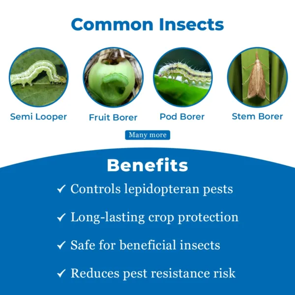 Tata Takumi insecticide provides long-lasting protection to the crops from lepidopteran pests like fruit borer, heliothis, and jassids. This highly effective insecticide enters the stomach of the insects and targets their muscle action, leading to their death. Takumi insecticide controls pests quickly and prevents feeding on the crops, reducing the risk of diseases that can be transmitted by the pests. It also has a phytotonic effect, which helps in improving overall crop growth, ensuring healthy and productive yield. Effective Target Control : Tata Takumi insecticide targets multiple pests, including caterpillars, worms, and pod borer. Phytotonic Effect : Takumi insecticide has phytotonic effects that help in increasing growth, improving stress tolerance, and flowering and fruiting. Dual-action : Tata Takumi insecticide works with systemic and contact action and provides complete control over pests. Non-Toxic : The chemical formulation of the insecticide t is relatively less toxic, making it safe to use and eco-friendly. The dose may differ according to the severity of pest presence. Takumi insecticide is suitable for Cotton, Vegetables, Fruits, Oilseeds, Pulses, and more. Tata Takumi insecticide targets pests such as Heliothis, Fruit Borer, Jassids, Leaf Folder, American Bollworm, Pod Borer, and Diamondback Moth. Store the product according to the instructions in the manual. Tata Takumi insecticide is used for agricultural purposes only.