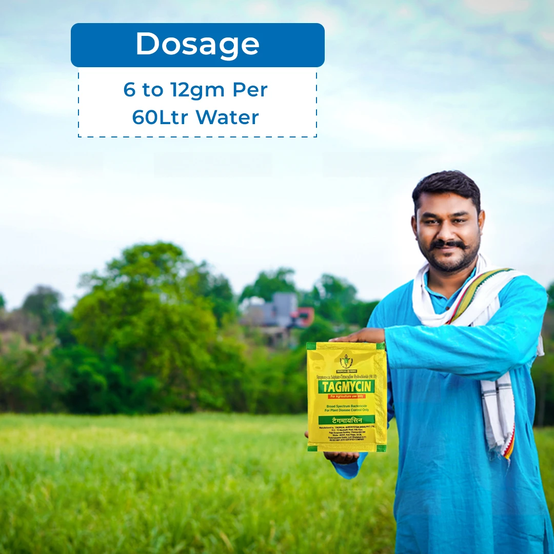 Tagmycin is a broad-spectrum chemical bactericide containing Streptomycin Sulphate 90% + Tetracycline Hydrochloride 10% SP. It controls bacterial infection in crops and improves crop quality by reducing the chances of crop loss. When applied after the crop is infected, Tagmycin is one of the most promising and highly effective bactericides and has good curative action against plant bacterial infection. Streptomycin Sulphate 90% + Tetracycline Hydrochloride 10% SP Broad Spectrum Control: Tagmycin controls various bacterial diseases and prevents damage. Improve Crop Health: Streptomycin Sulphate 90% + Tetracycline Hydrochloride 10% SP improves crop health by managing bacterial diseases and enhancing crop quality. Systemic Action: Its major active ingredients, Streptomycin Sulphate 90% and Tetracycline Hydrochloride 10%, help plants absorb the components and protect plant growth. Easy Application: Tagmycin can be used with foliar spray, seed treatment, and seedling root dips without hurdles. Enhance Crop Yields: The high-quality crops and reduction in crop damage significantly improve crop harvest. For Foliar Application: Use 6 to 12 gm of Tagmycin in 60 liters of water. Streptomycin Sulphate 90% + Tetracycline Hydrochloride 10% SP has a systemic mode of action. Tagmycin is suitable for Rice, Wheat, Apple, Cotton, Pulses, Cauliflower, and Oilseeds. Tagmycin effectively controls Bacterial leaf blight, Bacterial leaf spot, Angular leaf spot, and Stem canker in rice. Tagmycin is intended for agricultural purposes only. Contact our expert agronomists for guidance.